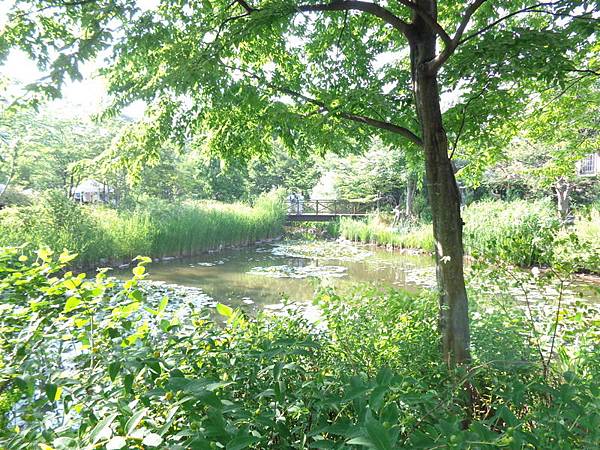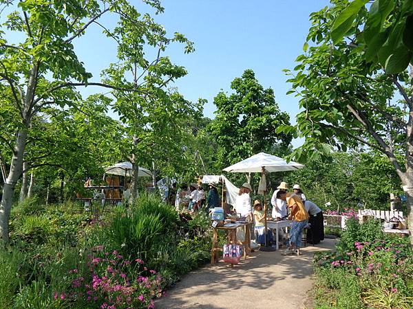 也許是因為太熱了,所以人沒有很多,完全不用排隊就輕鬆入場。入場後映入眼簾的是很像莫內畫裡畫的那種花園,有花、有池塘、還有很多樹葉會垂下來的樹。花園小徑裡一朵朵陽傘開著,有的是休息區有的是攤位,整體而言給人一種優閒自在的感覺。和其他市集很不一樣的是,這裡有很多「園藝」店,果然不虧是「Go Green」。