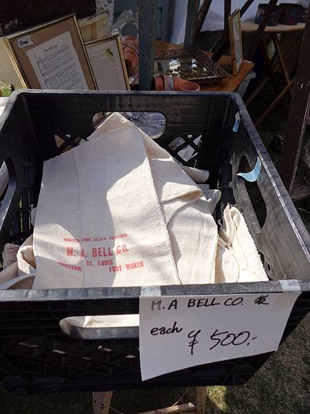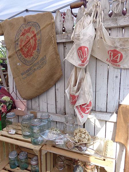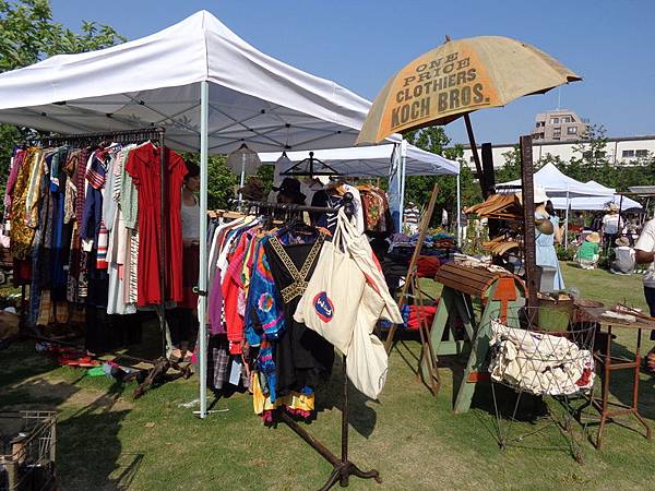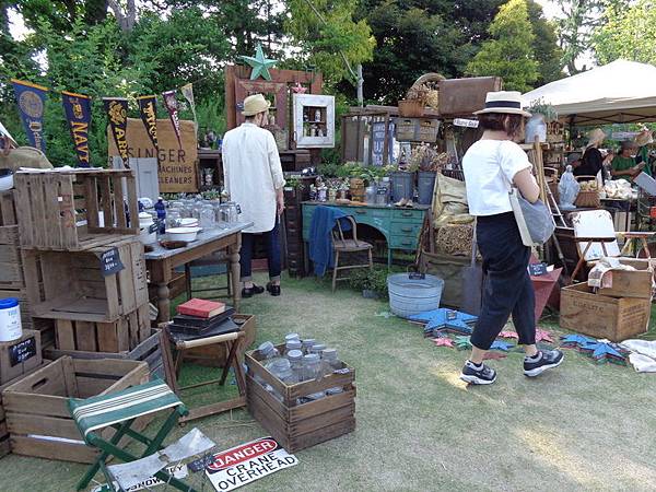 從花園的小徑繞去,來到一片草原,這裡的店面規模較大一些,以骨董商品、二手衣物、餐車為主。雖然和東京蚤の市一樣有很多古董和二手衣的店,但也許是因為空間和攤位、來客量的比例分配得比較適當,所以逛起來舒服很多。當然不只如此,我覺得這裡每一攤的特色都蠻明顯的,雖然是老東西,但每間商品的重點主題不同,不是那種什麼都賣得大雜燴,雖然價格一樣不便宜,但是起碼商品比較獨特,幾乎聞不到什麼大量生產或是商業化的氣息。