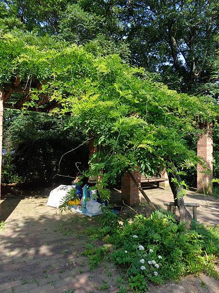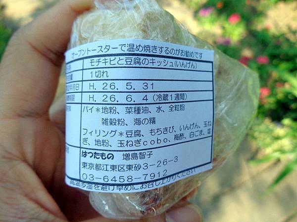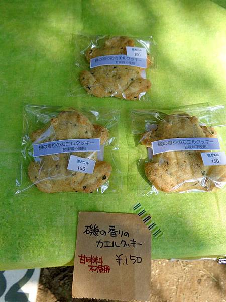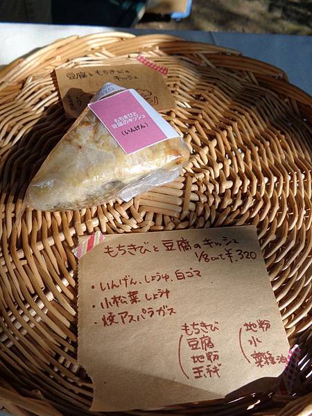 之後我在另外一個點心攤 OYATSUYA SUN買了一個洋蔥司康,又在另一個強調採用非動物性食材的點心攤はつたもの買了「豆漿蔬菜鹹派」和一個「青蛙香草餅乾」。豆漿鹹派相當令人驚艷,口感柔軟溫和,和裡面夾著著四季豆配合得很好,和一般用奶油和Cream做的鹹派比起來,完全不會膩!我在花園小徑裡找了一把陽傘,坐在下面吃著不知道是午餐還是下午茶的餐點,看著來來往往的人,真的相當悠閒。