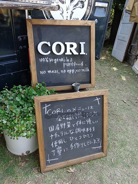 來說說我今天吃的食物,超級餓得我在前往市集的路上仔細看了部落格上的介紹,決定這次一定要吃到CORI這台餐車(這台餐車已經在過去的市集遇到三次,但每次都大排長龍,沒有排他個一小時根本買不到)。CORI賣的是純素食,所有餐飲都是100%植物性原料,採用日本國產蔬菜,飲料不加白砂糖,就連醬料也是自己製作,最招牌的是「大豆炸雞」(用豆皮做的)外表和吃起來的口感、味道就跟平常吃到的炸雞沒兩樣。