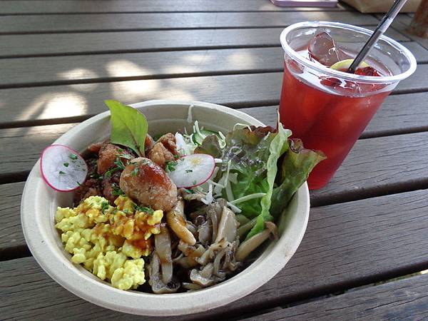 我點了一碗素食丼,裡面有五穀豆子飯、大豆炸雞、莎拉、豆腐做的沙拉(很像一般吃到的雞蛋沙拉)以及味增拌香菇。餐點用紙碗裝著,看起來分量不大,但吃起來相當有飽足感。儘管純素食,但是吃起來卻一點也不單調,有點重口味的炸雞搭配簡單的五股豆子飯,味到調和得剛剛好,相當滿足的一餐。